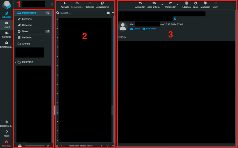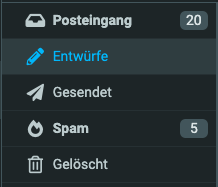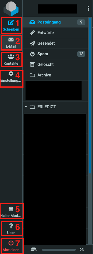 Die Seitenleiste des Webmailers auf der linken Seite ist immer verfügbar, unabhängig davon, wo man sich gerade im Webmailer befindet. Sie gliedert sich in folgende Bereiche: