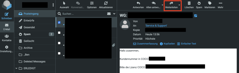 Klicke auf die Mail, die du weiterleiten möchtest und dann auf die Schaltfläche weiterleiten: