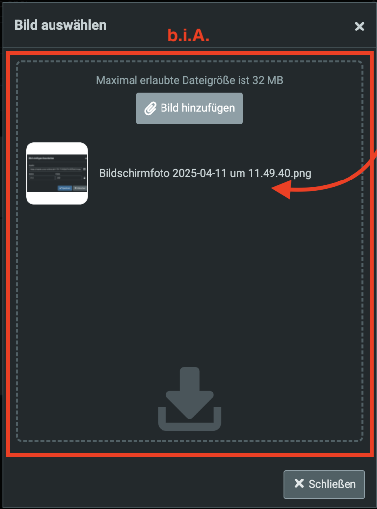 - Ziehe das gewünschte Bild aus deiner Dateiablage per drag-and-drop in den Kasten mit der gestrichelten Linie oder