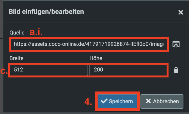 - Passe bei Bedarf die Breite und Höhe an, in welcher das Bild im Text eingebunden werden soll. Ist das Schloss rechts geschlossen, so verändert sich der zweite Wert im Verhältnis des Original-Bildes mit, sofern ein Wert angepasst wird.