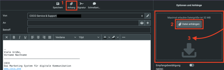 - Ziehe in den gestrichelten Kasten unter Datei anhängen deine Datei per drag-and-drop hinein.